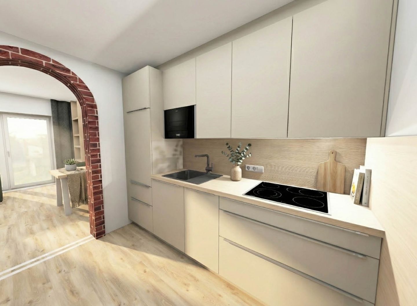 - Voll ausgestattete Küchenzeile mit Kühlschrank, Herd und diversen Kochutensilien